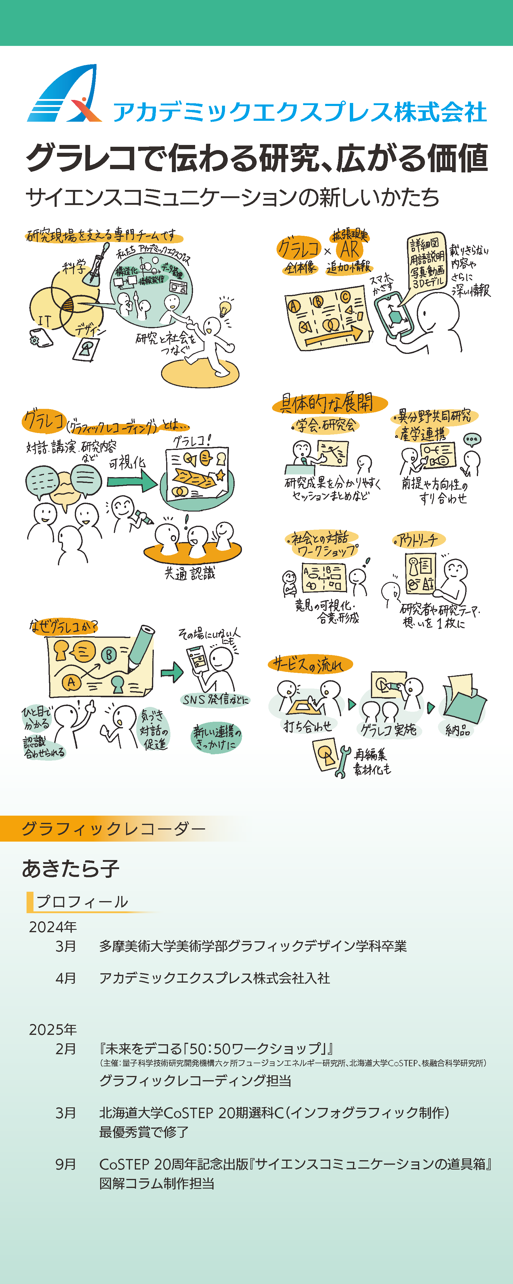 グラレコはサイエンスコミュニティや研究機関の広報現場ではまだ、十分に普及していないのが事実です。来場者の反応からは「分かりやすさ」や「親しみやすさ」と感じていただき、プレスリリースや展示で使いたいという声がいただき、サイエンスコミュニケーションの新しいツールとしてのグラレコの活用場面が増えるという手応えが得られました。
