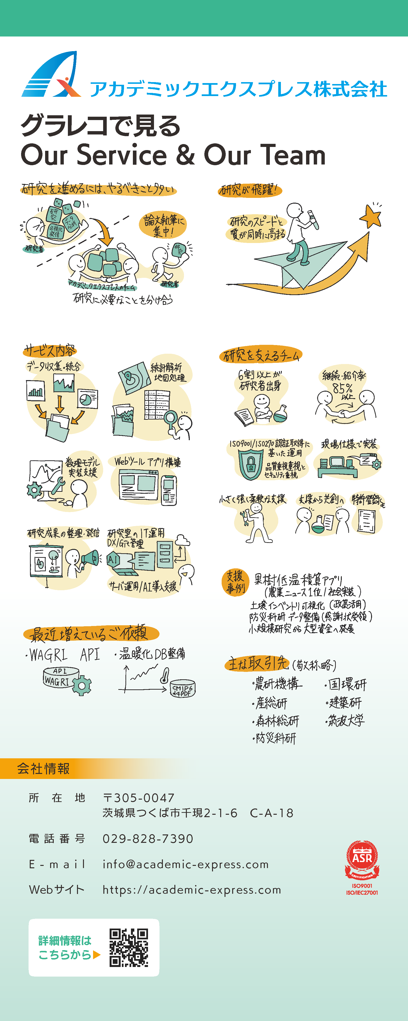 グラフィックレコーディング(以下:グラレコ)は、会話やプレゼンの要点をその場で視覚化する技法です。当社は「研究内容や成果をわかりやすく、親しみやすく伝えるツール」としてのグラレコのそのものと活用シーンの紹介(ポスター1)、活用事例として、「グラレコによる自社のサービスの案内」の2枚のポスターを展示しました。